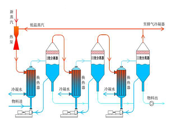 三效蒸發器主要由相互串聯的蒸發器、冷凝器、鹽分離器以及復制設備等組成三組蒸發器,以串聯的形式組成一整套的三效蒸發系統。