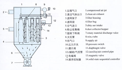 含塵氣流從進氣口進入下箱體后,部分沉降,輕微粉塵浮動時被濾袋阻留,凈化空氣透過濾袋,經文氏管進入上箱體,從出氣口排出。積附在濾袋外壁的粉塵不斷增加,當阻力在限定(一般為80-120毫米水柱)的范圍內,就要清除積附在濾袋外壁的粉塵,清灰是由控制儀定期順序觸發各控制閥,開啟脈沖閥,使氣包內的壓縮空氣由噴吹管孔噴出(一次風)通過文氏管誘導數倍于一次風的周圍空氣(二次風)進入濾袋,使濾袋在一瞬間急劇膨脹并伴隨著氣流的反向作用,被抖落的粉塵落入灰門經排灰閥排出機體。
