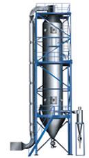 本機(jī)組工作過(guò)程為料液通過(guò)隔膜泵高壓輸入,噴出霧狀液滴,然后同熱空氣并流下降,大部分粉粒由塔底排料口收集,廢氣及其微小粉末經(jīng)旋風(fēng)分離器分離,廢氣由抽風(fēng)機(jī)排出,粉末由設(shè)在旋風(fēng)分離器下端的授粉筒收集,風(fēng)機(jī)出口處還可裝備二級(jí)除塵裝置,回收率在96-98%以上。