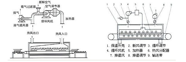 工作原理 DWP型屬噴射氣流帶式干燥類型,熱風以狹縫流或孔束流向下或上下同時噴向輸送帶上的物料,由于噴射氣帶高達15m/s以上,故對流傳熱的傳熱膜極薄,傳熱系數大,干燥速度快。該設備用于不透氣類物料時,上面噴射氣流仍返回上面,下面噴出的氣體仍返出下面,再參與循環。對透氣性物料如涂膜布干燥等,也適用于片狀物料及一些特殊物料的干燥。如果采用雙向氣流噴射,板材之類物料干燥后變形小。噴射氣流干燥使用熱源可以是蒸氣、電、熱風爐及燃油煙道氣等。